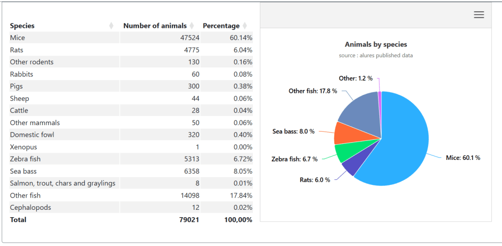 Últimas estatísticas (2022) do número de animais usados para fins científicos em Portugal, por espécie.